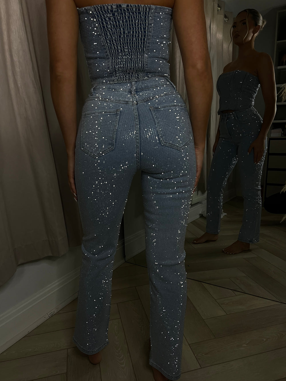 Bring the glam in our Light Blue Straight Leg Jeans, fully embellished with dazzling diamantés that sparkle with every step. Cut in a classic straight-leg silhouette and finished with clean hems, these jeans are a true statement piece—perfect for when you want all eyes on you.