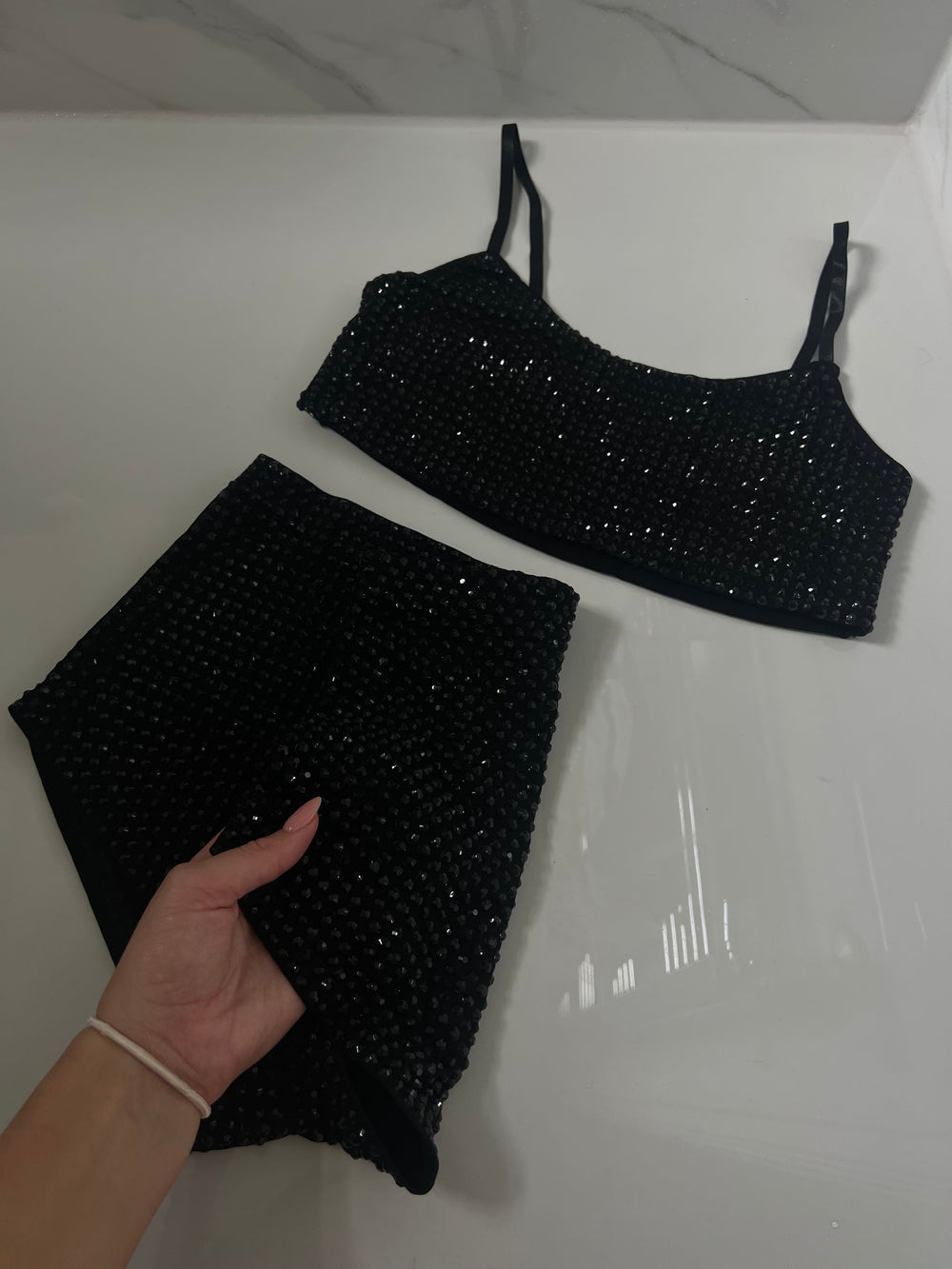 Turn heads and steal the spotlight with this stunning black two-piece set adorned with shimmering rhinestones. The crop top features adjustable spaghetti straps for a perfect fit, while the high-waisted shorts hug your curves with comfort and style. Each piece is meticulously covered in sparkling crystal embellishments, catching the light from every angle for a glamorous, show-stopping look. Perfect for performances, nights out, or when you simply want to shine.